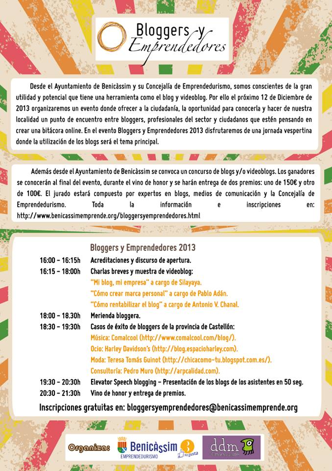 Compartimos con vosotros este Encuentro de Bloggers que se ha organizado en Benicassim. Un encuentro de bloggers y emprendedores el próximo 12 de diciembre. Y además cuenta con un concurso de Blogs. Toda la info en Benicassim Emprende